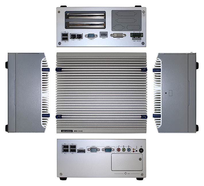 The image below shows the top view and all four side views of the ARK-3440. The housing is all-metal and feels exceedingly solid. Note the clean and purposeful design and execution that facilitates easy integration as well as easy expansion and painless maintenance.
