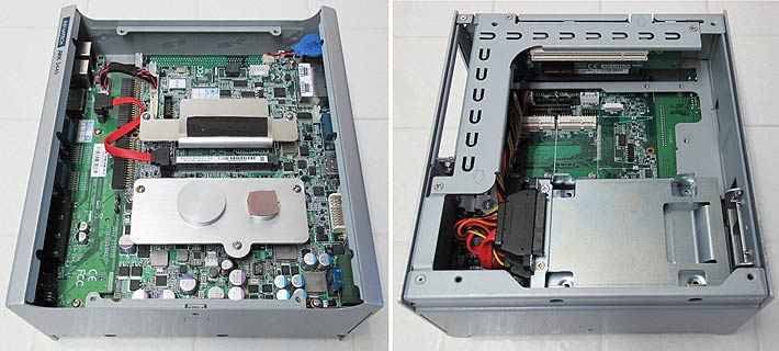 The above-right picture shows the ARM-3440 with the bottom plate removed. This provides insight into the speedy IPC's considerable, and very flexible, expansion capabilities. At the bottom is the hard disk subframe that can accommodate two 2.5-inch disks. It is shock-mounted onto the housing via rubber bumpers. Above that, on the main board, there are two unused mini-PCIe slots. While the ARK-3440's economy-minded ARK-3403 sibling has a SIM Card caddy, there does not appear to be oen in the 3440. Above that is a daughterboard that can contain either two 5 Volt 32-bit half-length PCI slots (5 Volt keying), a PCI and a PCIe x1 or PCIe x4 slot, or two PCIe x1 slots.