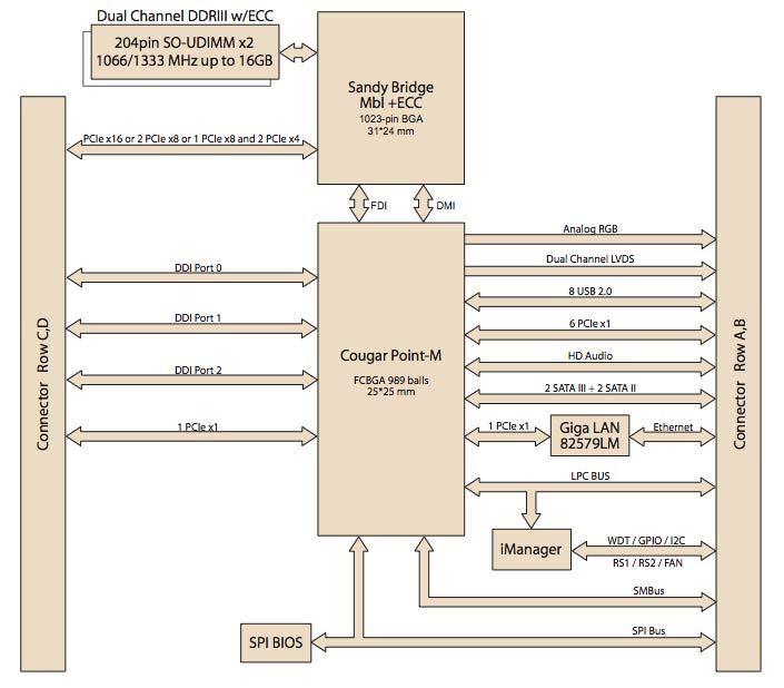 All processor options use the same complementary Intel QM67 chipset. As you can see from the processor specs, not only are those all chips with "embedded" designation (i.e. extended life cycle support, etc.), but they offer the new technologies at a wide range of performance and economy. That is quite remarkable, and makes these new serial differential signaling technology-based modules suitable for a variety of performance-oriented applications.