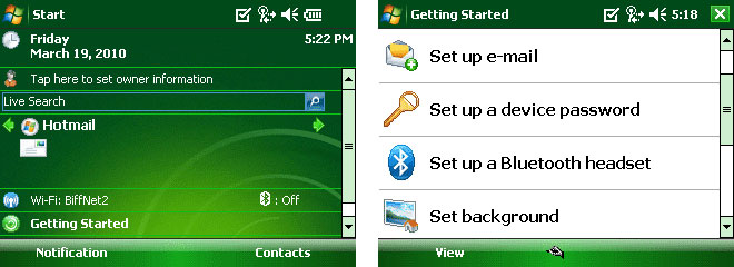 When you turn on the device, you get the familiar Today screen that shows an overview of the current status and provides one-click access to common tasks such as email, calendar, tasks, contacts, wireless settings and so on. The TK6000 also comes with a helpful "Getting Started" tutorial that guides new users through common tasks such as setting up email, setting passwords, setting up a Bluetooth headset, and so on.