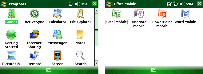 Windows Mobile 6.1 has a Programs folder where most of the application icons are. Some applications, such as the mobile versions of the major Microsoft Office applications, have their own separate folder (see screenshot below to the right).