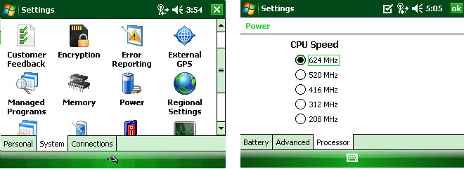 Instead of the Windows Control Panel, Windows Mobile has a number of Settings screens, divided into Personal, System and Connections utilities. There are quite a few of them, and some are pretty involved. The Power utility shown on the right lets you select maximum allowable CPU speed. Now there's an idea for Toyota!