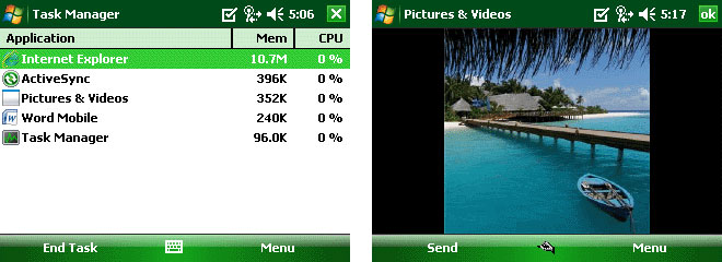 Windows Mobile includes useful utilities such as the Task Manager that shows you active applications and how much memory and CPU capacity they use. Since Windows Mobile cannot display multiple overlapping windows at a time, the Task Manager is also a good way to switch between running applications. The pretty picture to the right illustrates the Pictures & Videos applications, sort of a basic media player that offers one-click access to emailing pictures. You can also zoom in and out, and automatically resize pictures.