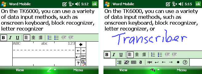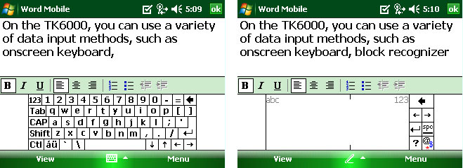 For data entry, the Windows Mobile-based TK6000 offers a wealth of options. There is the keypad, there is a nice pop-up keyboard, and three are also no fewer than three different ways of recognizing text. The methods are: