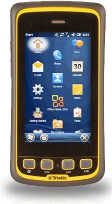 In terms of tech specs, Trimble's latest is based on the Texas Instruments DM3730 processor running at 800MHz or 1GHz. This is an OMAP-compatible package with an ARM Cortex-A8 core, a NEON SIMD coprocessor, and a POWERVR SGXTM Graphics Accelerator. The large 4.3-inch capacitive multi-touch display offers 480 x 800 pixel WVGA resolution, with both the touch technology and the screen resolution up to current smartphone standards, rather than legacy handheld technology. Other new-era tech includes a high-res 8 megapixel camera (that can automatically add time and location data from the GPS receiver), a micro-SD card slot that can accommodate cards up to 32GB, speedy 802.11n WiFi, optional 3.75G mobile broadband, and — this being a Trimble device — integrated WAAS/SBAS capable GPS with an MCX port for an optional external antenna. Later, Trimble also made available real-time enhanced GPS with 1-2 meter accuracy.