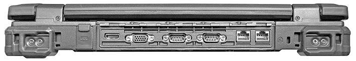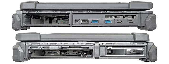 Ports and connectivity are placed on the left, right and back sides of the laptop. The ports on each side are located behind hinged plastic covers with sliding locks that protect against physical damage and are also designed to provide full protection against dust and liquids. All covers are screwed on and therefore are, if need be, replaceable.