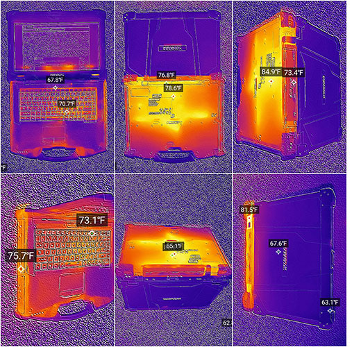 The pictures on the left were taken with our infrared/thermal camera while the Z14I was running benchmarks. The bright yellow areas is where the DURABOOK heated up most. This new model with Core Ultra Series 1 165U processor remained almost unbelievably cool during all benchmark runs. It actually ran cooler the 2nd gen model even with 15/57 watt processor compared to the 12/28 watt chip in the predecessor model. It is amazing how much heat a heavy metal chassis, combined with sophisticated thermal management, can soak up, spread, and disseminate. Keeping temperatures reasonably low has a direct impact on overall systems performance. That's because maximum achievable processor "turbo" clock speeds, and how long a system can run at high clock speeds, depend on temperature readings. That said, passively cooled systems require different, more conservative thermal settings, something that durabook has years of experience with.
